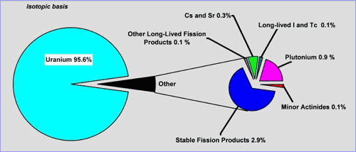“More than 95 percent of what went in hasn’t changed at all,” says McCarthy of typical LWR fuel. “The rest of it -- less than five-percent -- is primarily stable fission products -- -- they don’t decay -- and a very small amount of them are radioactive.”